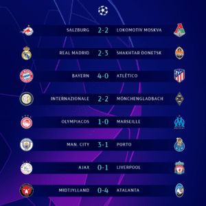 Nelle altre gare di serata tonfo del Real Madrid che perde 3-2 in casa contro lo Shakhtar. Vittoria in goleada del Bayern sull’Atletico Madrid. Successo in rimonta del Manchester City 3-1 sul Porto. Vittorie importanti del Liverpool, 1-0 ad Amsterdam con l’Ajax, e dell’Olympiacos in casa con l’Olympique Marsiglia. Finisce 2-2 tra Salzburg e Lokomotiv Mosca.