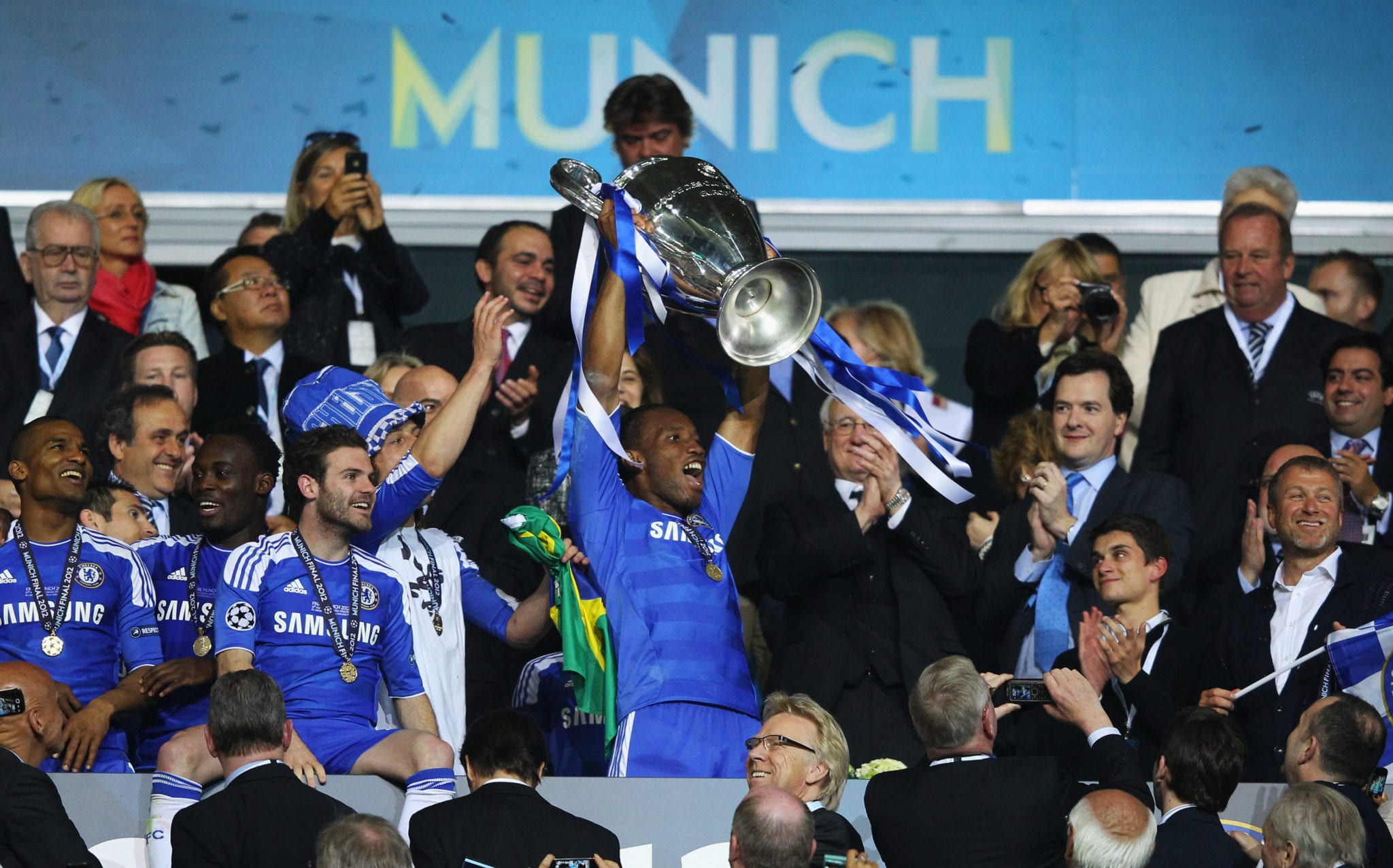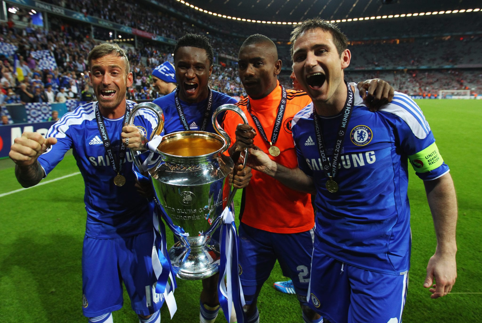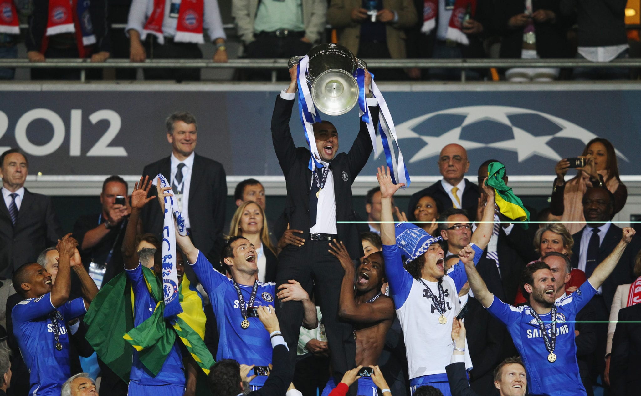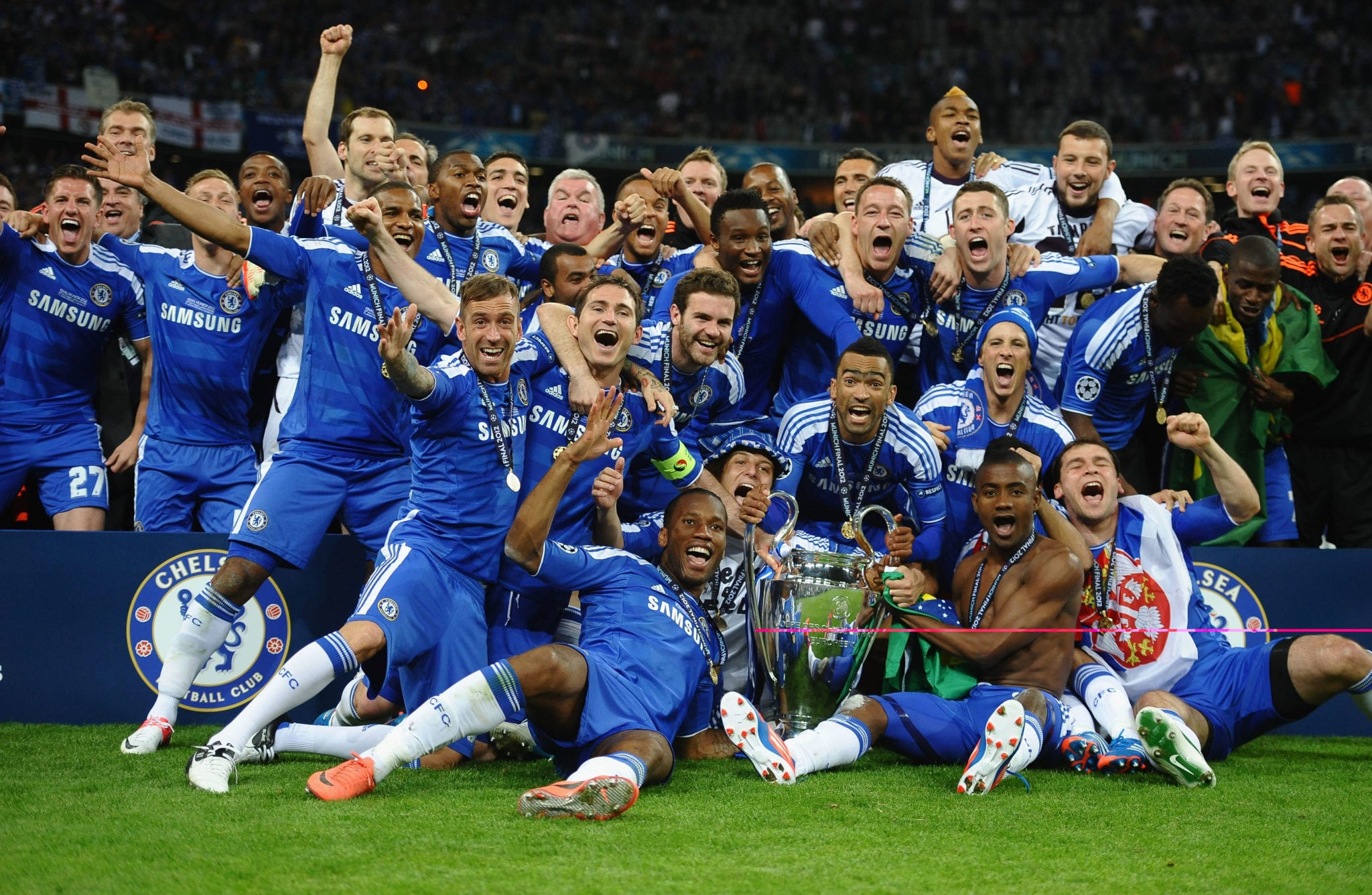 Il Chelsea vince la Champions League 2011/2012 battendo nella finale di Monaco i padroni di casa del Bayern Monaco 5-4 dopo i calci di rigore. I tempi regolamentari si erano conclusi sul risultato di 1-1 scaturito dalle reti all’83’ di Thomas Muller e all’88’ di Didier Drogba. Nei tempi supplementari non cambia il risultato non fosse altro per il rigore sbagliato da Arjen Robben ad inizio del primo tempo supplementare. Si va ai calci di rigore e il Chelsea scaccia via i fantasmi di Mosca 2008. Per i bavaresi decisivi gli errori di Olic e Schweinsteiger. Didier Drogba, uomo partita, segna il rigore decisivo e porta i blues sul trono d’Europa.