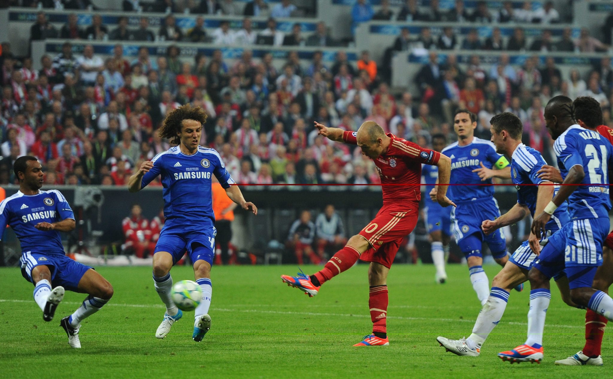 TEMPI SUPPLEMENTARI – Parte benissimo il Chelsea galvanizzato dall’insperato pareggio ottenuto e prova a colpire in contropiede senza riuscirci. Quando il Bayern sembra calare, ecco Drogba che scalcia in area di rigore Frank Ribery e provoca il rigore che può riportare in vantaggio i bavaresi. Dal dischetto va Arjen Robben che prende la rincorsa e si fa parare il rigore da Petr Cech. A questo punto la serata dei tedeschi comincia a prendere le sembianze di un incubo e il primo tempo supplementare si volatizza così come il rigore gettato alle ortiche dal numero 10 olandese. Il secondo tempo supplementare vede il Bayern provarci a più riprese ma senza due giocatori chiave come Ribery e Muller (sostituiti). La grande occasione capita sui piedi di Ivica Olic che imbeccato dal capitano Lahm, mette al centro un pallone sul quale Van Buyten non ci crede. Finiscono i supplementari con il punteggio di 1-1. Grande rammarico per il Bayern costretto alla lotteria dei calci di rigore dopo aver avuto a più riprese la partita in pugno. Il Chelsea non ha bei ricordi visto che nel 2008 perse ai rigori la finale Champions contro il Manchester United.