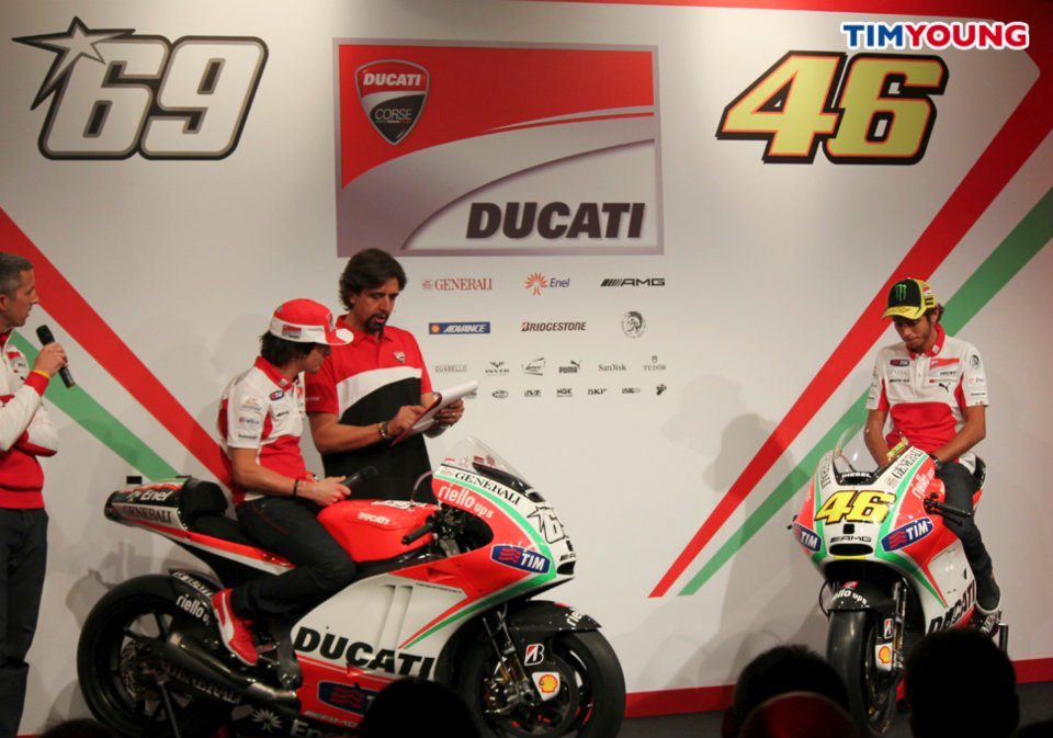 Presenti al lancio della nuova Ducati GP12, oltre ai due piloti, il papà della nuova “Rossa” Filippo Preziosi e il presidente Gabriele Del Torchio, che con il nuovo progetto sperano di riscattare un anno pieno di delusioni e povero di soddisfazioni. Alla presentazione era presente anche Valerio Staffelli, inviato di Striscia La Notizia, che ha dato, in veste di presentatore ufficiale, un pizzico di ironia alla cerimonia, scherzando più volte con i piloti.