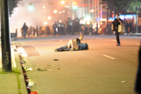 Ciò che più ha colpito l’attenzione non solo degli sportivi ma un pò di tutte le persone interessatesi alla vicenda della sommossa cittadina è stata una foto, scattata in un particolare momento, in cui si vede una ragazza, sdraiata sulla strada, ed un ragazzo, appena sopra di lei, baciarsi in una zona “di nessuno” con i rivoltosi da una parte ed i poliziotti contrapposti dall’altra. La foto ha suscitato diverse opinioni: in un primo momento si era parlato di un giovane che approfittava di una ragazza in stato di semi-incoscienza, più tardi si è invece scoperto che i protagonisti sono 2 fidanzati: lei è Alex Thomas, studentessa presso l’Università di Guelph in Ontario, lui invece è Scott Jones, australiano di 29 anni, in Canada per motivi di lavoro. Hanno fatto luce sull’accaduto dicendo che la ragazza è stata spinta dalla polizia a terra, senza nessun motivo apparente dato che i 2 stavano cercando di mettersi al sicuro, e subito dopo il fidanzato le ha prestato soccorso, cercando di tranquillizzarla. L’immagine resterà emblematica nella storia: in una notte che definire folle e pazzesca è dire veramente poco, ecco spuntare in mezzo al caos più totale, in mezzo a scene di guerra, l’amore di 2 giovani ragazzi, distesi a terra in una zona lasciata libera, come sospesa in un’altro tempo o in un’altra dimensione, incuranti di tutto ciò che li circonda, l’unica cosa che importa è il loro sentimento e il cercare di restere assieme. L’arrivo del nuovo giorno ha lasciato in dote a Vancouver quasi 150 feriti, di cui 8 accoltellati (uno in condizioni gravi) e ben 100 arresti, ma tra il fuoco, le fiamme, il fumo e la violenza, arriva diretto al cuore di noi tutti un gesto che regala speranza: il “Vancouver riot kiss” (così è stata rinominata l’azione dei 2 fidanzati) dimostra che l’amore può trionfare sulla guerra.