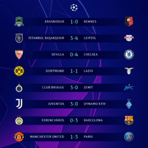 Nelle altre gare di serata poker di Giroud grazie al qual il Chelsea espugna 4-0 Siviglia e conquista il primo posto nel girone, battendo 1-0 il Rennes il Krasnodar si garantisce l’Europa League. Il Bruges batte lo Zenit, si garantisce come minimo l’Europa League ed andrà a Roma a giocarsi il passaggio del turno agli ottavi di Champions contro la Lazio. Il Ferencvaros crolla contro il Barcellona e si giocherà tutto nello scontro diretto con la Dynamo Kiev. Ingarbugliatissimo il girone H, il Lipsia vince nel recupero 4-3 in casa del Basaksehir e visto il successo del Psg a Manchester, rimane a pari punti con United e francesi.