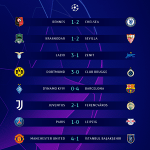 Nelle altre gare di serata vincono entrambe 2-1 in trasferta il Chelsea (in casa del Rennes) ed il Siviglia (contro il Krasnodar) e si qualificano matematicamente agli ottavi. La doppietta di Haaland ed il gol di Sancho permettono al Borussia Dortmund di battere 3-0 il Bruges e consolidare la vetta del girone. Nel gruppo H il Manchester United batte 4-1 il Basaksehir e rimane in testa nel girone, la sfida per il secondo posto va al Psg che vince 1-0 sul Lipsia ed aggancia a quota 6 i tedeschi.