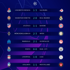 La serata di Champions ha emesso alcuni verdetti, il Liverpool ha battuto l’Ajax ed ha ottenuto passaggio e 1° posto. Il pari tra Atletico e Bayern lascia vive le speranze del Salzburg, vittorioso a Mosca, gli austriaci si giocheranno tutto in casa contro i colchoneros. Lo 0-0 tra Porto e Manchester City regala il 1° posto ai citizens e la qualificazione anche ai portoghesi. L’Olympique Marsiglia batte l’Olympiacos e tiene vive le speranza Europa League.