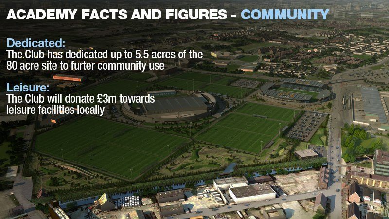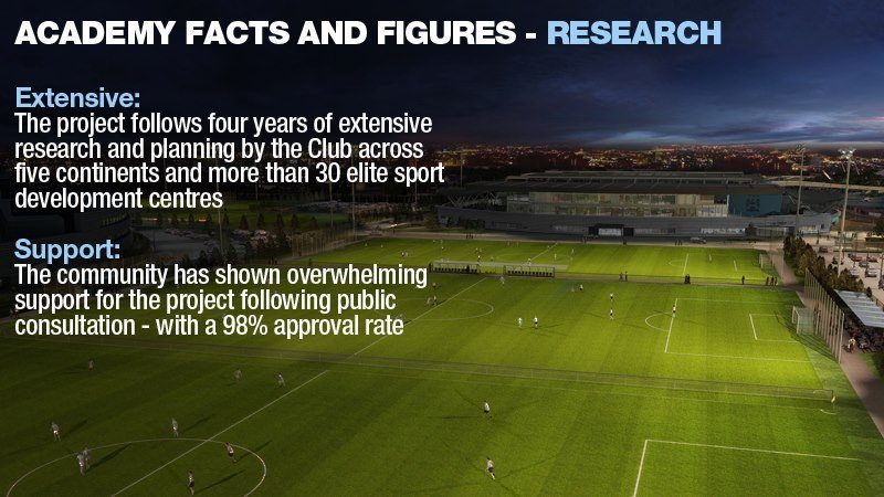Ci saranno anche una palestra, un refettorio e un centro di riabilitazione. Lo stadio per le partite ufficiali potrà contenere ben 7000 spettatori e il Campus sarà inoltre collegato attraverso un ponte allo stadio Etihad, quello dove gioca la prima squadra. Il progetto, tra l’altro, ha ricevuto l’approvazione quasi in toto della comunità locale. In una consultazione svoltasi nel 2011 infatti ben il 98% della comunità locale si è espressa favorevolmente alla costruzione della City Football Academy, riconoscendo l’impatto positivo che la stessa avrà sul calcio giovanile oltre che sull’economia locale e ambientale del territorio ma anche per via del maggior numero di strutture presenti grazie a questa iniziativa del club allenatore da Roberto Mancini.