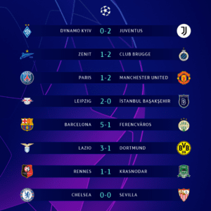 Nelle altre gare di serata vittoria in goleada del Barcellona 5-1 sul Ferencvaros. Vince anche il Lipsia, 2-0 al Basaksehir. Colpo a sorpresa del Bruges in casa dello Zenit ma soprattutto cade in casa il Psg, 2-1 contro il Manchester United, grazie al gol nel finale di Rashford. Finiscono in parità Rennes-Krasnodar (1-1) e Chelsea-Siviglia (0-0).